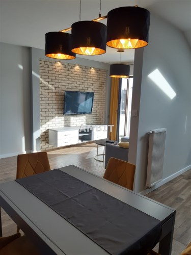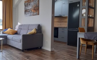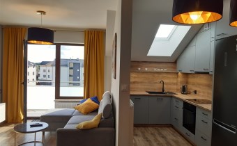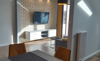salon z wyjściem na balkon. W salonie wydzielona strefa jadalna ze stołem i krzesłami, która płynnie przechodzi w dobrze wyposażony aneks kuchenny.