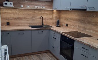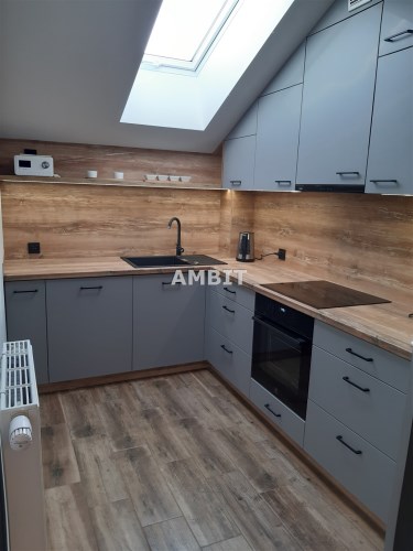 Kuchnia z zabudową meblową i sprzętem AGD (lodówka, płyta indukcyjna, piekarnik, zmywarka, mikrofala), doświetlona oknem dachowym.