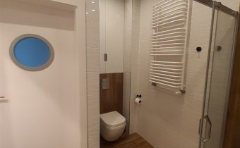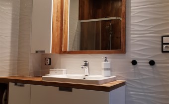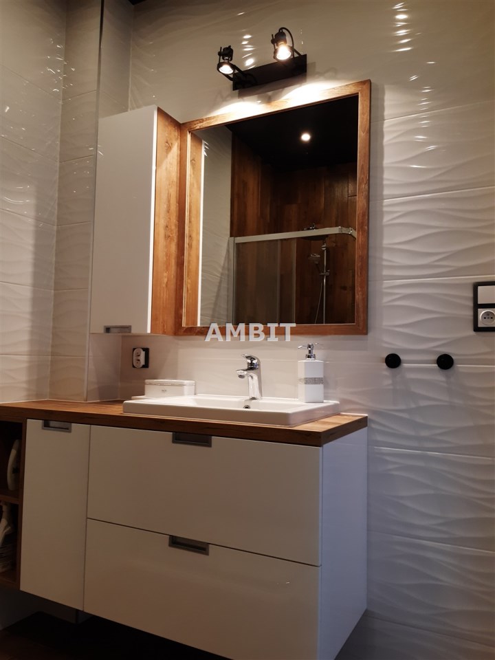 Łazienka w jasnej glazurze, z kabiną prysznicową. Wykończona ciekawymi detalami, z zabudową meblową.
