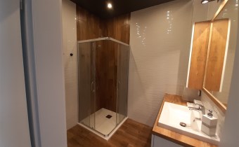 W całym mieszkaniu na podłodze położona terakota imitująca deskę.
