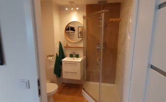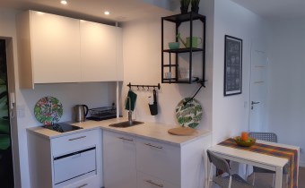 Aneks kuchenny z 2 palnikową płytą indukcyjną, mini zmywarką i lodówką. Nowa zabudowa na wymiar.