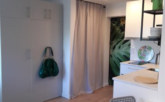 Wyposażony w rozkładaną kanapę, dużą szafę, biurko.