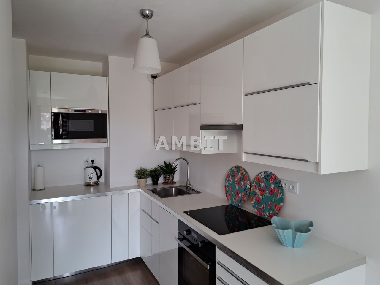 W aneksie kuchennym biała zabudowa meblowa z płytą indukcyjną i piekarnikiem, zmywarką, mikrofalą i lodówką podblatową.
