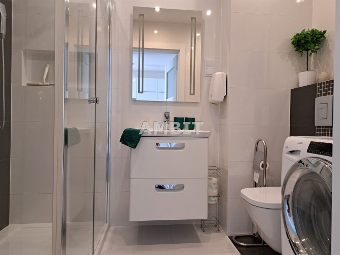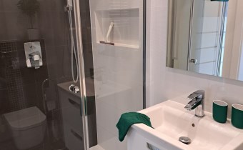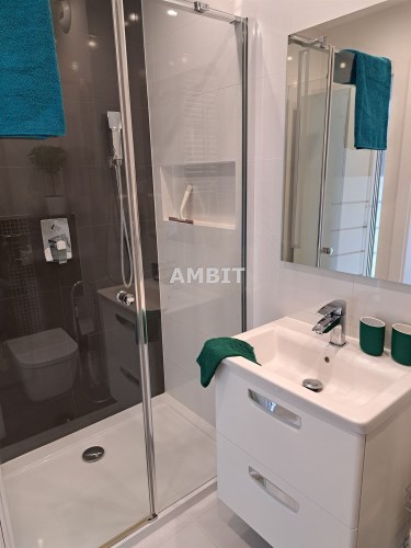 Łazienka razem z wc w białej glazurze, z kabiną prysznicową. Na wyposażeniu jest pralka wraz z suszarką. W przedpokoju dodatkowa szafa z półkami i miejscem na rzeczy wiszące.